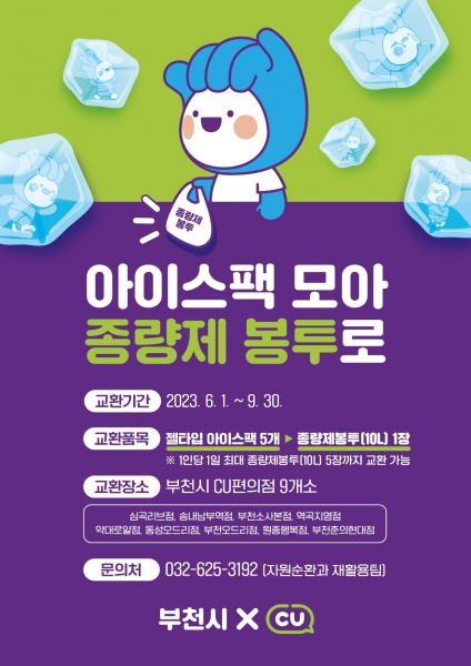 시민들은 CU편의점 송내남부역점 심곡리브점 부천소사본점 역곡지영점 약대로얄점 동성오드리점 부천오드리점 원종행복점 부천춘의현대점 총 9곳에서 젤타입 아이스팩 5개당 종량제 봉투 1개로 교환할 수 있다.