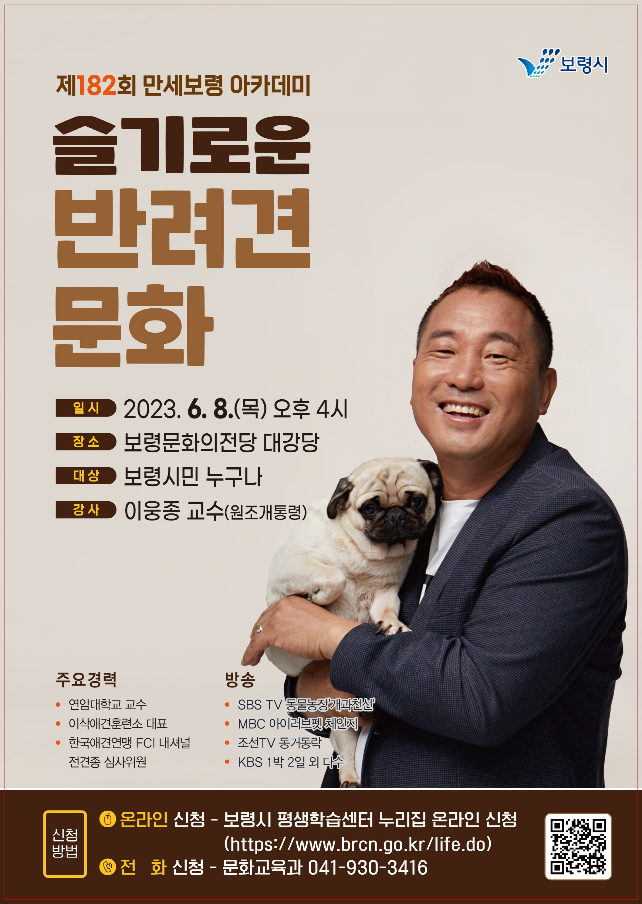 보령시는 오는 8일 오후 4시 보령문화의전당 대강당에서 이웅종 교수를 초빙해 ‘슬기로운 반려견 문화’라는 주제로 제182회 만세보령 아카데미 강연을 개최한다.