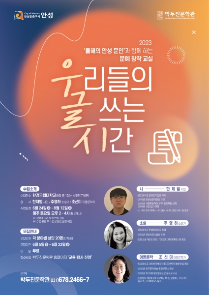 수업을 진행할 3명의 작가는 시 ‘저수지의 목록’, ‘유니폼’ 등을 발표한 한재범 시인, 단편소설 ‘굴과 모래’, ‘타조에 대해 말해봐’를 발표한 주영하 소설가, 단편동화 ‘할머니의 유모차’, ‘파란 운동화’ 등을 발표한 조선미 아동문학가로 지난 5월 ‘안성 문인 지원사업’을 통해 2023년 ‘올해의 안성 문인’으로 선정된 안성의 신진 문인들이다.