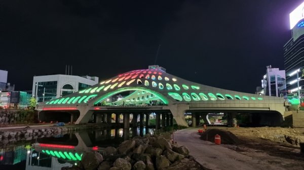 개선사업에는 교량 상징조형물 및 배면·교각 이미지 연출 상징조형물 내부 은하수 조명 12등 기상전광판 4개 상부 써치라이트 1개 등이 투입됐다.