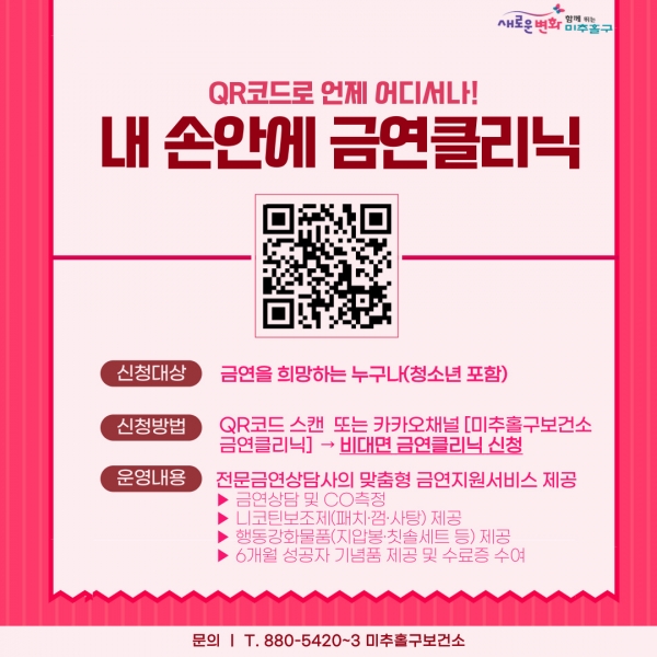 금연클리닉 미등록자는 물론 기존 등록자 누구나 상담할 수 있으며 비대면 등록을 원하는 경우 카카오톡에서 ‘미추홀구보건소 금연클리닉’을 검색하거나 포스터 상의 QR코드를 스캔 후 금연클리닉 등록신청서를 제출하면 된다.