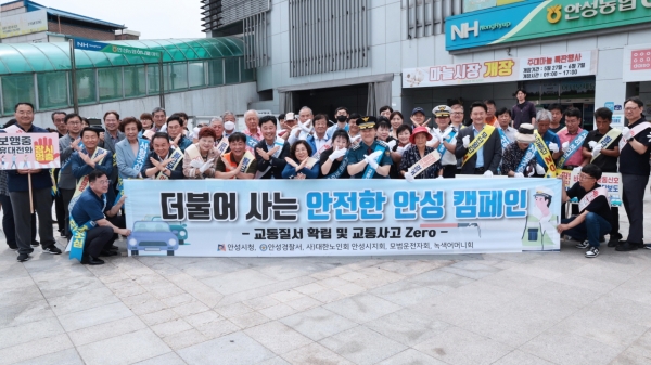 [금요저널] 안성시는 안성시의 최근 3년간 교통사고 사망사고 유형을 파악. 분석한 결과 어르신, 보행자로 사망사고 비율이 높아 보행자 및 어르신 중심으로 무단횡단 및 교통법규 준수를 집중 홍보하고자 어르신들의 활동이 많은 안성장날 인지사거리~석정삼거리 구간에서 안성시청, 안성경찰서 안성녹색어머니회, 안성모범운전자회, 대한노인회 안성시지회 등 각 기관 관계자들과 함께 ‘더불어 사는 안전한 안성’ 캠페인을 진행했다.