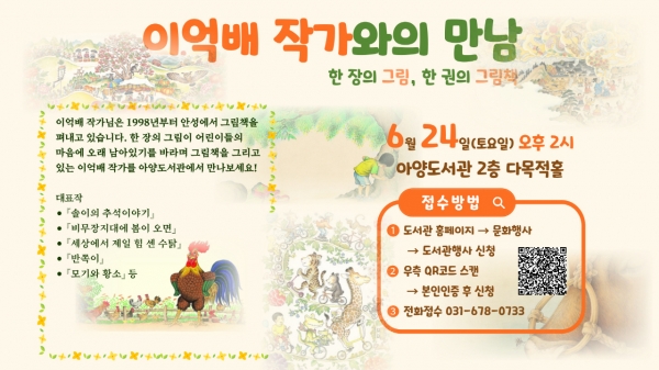 [금요저널] 안성시 아양도서관은 6월 24일 토요일 오후 2시부터 ‘이억배 작가와의 만남’ 행사를 진행한다.