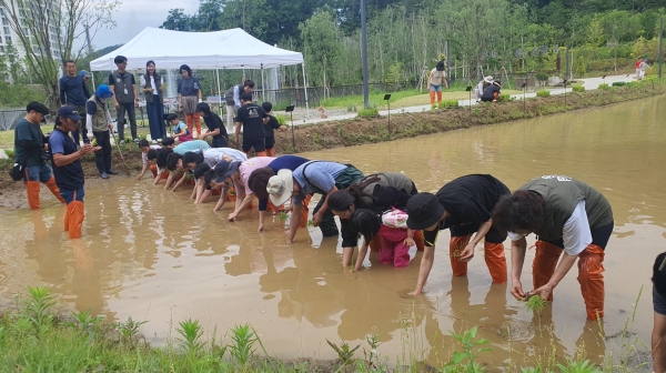 수원수목원 서포터즈, 현장에서 선착순으로 신청한 시민 30명 등이 영흥수목원 내 530㎡ 규모로 조성된 논 전시원에 한반도 16도를 대표하는 토종벼와 수원시와 연관 있는 ‘수원조’, ‘통일벼’를 심었다.