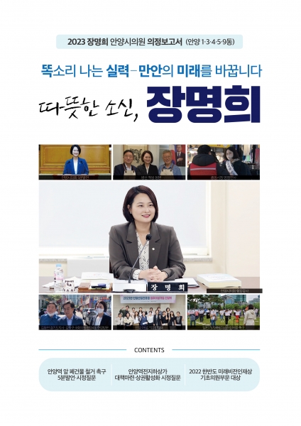 ‘똑소리 나는 실력, 만안의 미래를 바꿉니다’라는 타이틀로 시작하는 장 의원의 의정보고서에는 안양 만안구 지역 발전을 위해 달려온 지난 1년간의 의정활동성과가 정리되어 있다.