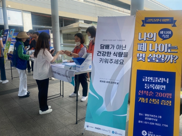 팔달구보건소는 2023년 세계 금연의 날 주제인 ‘담배가 아닌 건강한 식량을 키워주세요’을 홍보하고 시민들을 대상으로 금연 상담을 하고 보건소의 금연 사업을 안내했다.