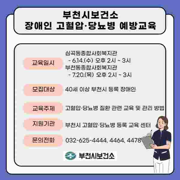 [금요저널] 부천시는 40세 이상 부천시 등록 장애인을 대상으로 고혈압·당뇨병 예방 교육을 진행한다.