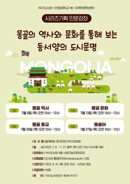 이번 강의는 안양대학교 HK+사업단 지역인문학센터와 함께 진행하는 시리즈기획 인문강좌의 두 번째 과정으로 총 4회에 걸친 강의를 통해 몽골의 역사와 문화, 종교, 언어 등을 배울 수 있다.