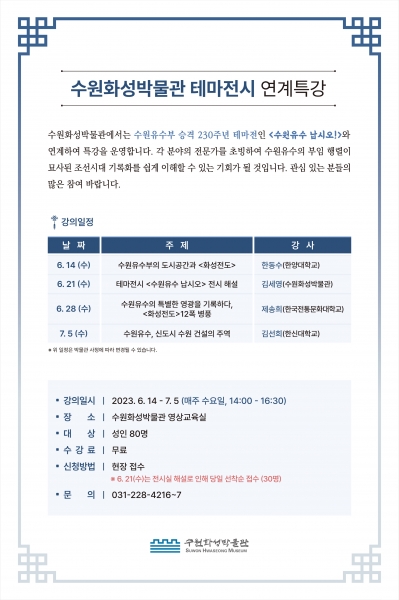 수원시 관계자는 “테마전 ‘수원유수 납시오’를 이해하고 230년 전 수원의 역사적 위상을 살펴볼 수 있는 강의가 될 것”이라고 말했다.