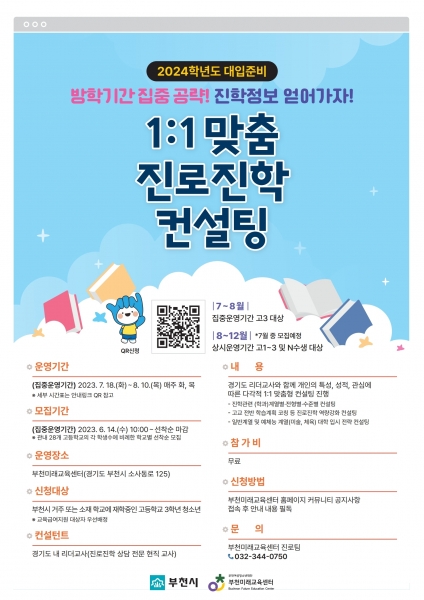 [금요저널] 부천시는 부천미래교육센터에서 관내 고등학생 및 일반수험생을 대상으로 하는 ‘1:1 맞춤 진로진학 컨설팅 창구’를 오는 7월 18일에 처음 오픈한다고 밝혔다.