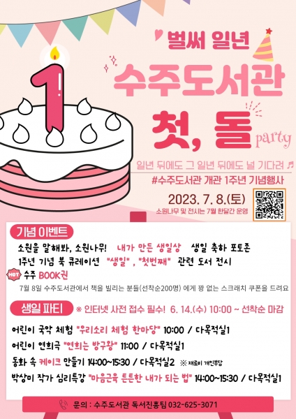 [금요저널] 부천시는 수주도서관 개관 1주년을 맞아 오는 7월 8일 시민들과 함께 수주도서관의 첫 돌을 축하하고 즐길 수 있는 다양한 행사를 운영한다고 밝혔다.
