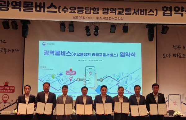 수원시를 비롯해 공모사업 대상지로 선정된 6개 지자체와 국토교통부, 경기도는 14일 서울 상암 DMC타워 DMC홀에서 협약을 체결하고 광역콜버스 시범사업에 적극적으로 협력하기로 했다.