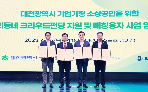 대전시는 15일 이택구 시 행정부시장, 중소벤처기업부 이대희 소상공인정책실장, 정상봉 대전신용보증재단 이사장, ㈜비플러스 박기범 대표가 참석한 가운데,‘우리동네 크라우드 펀딩 지원 및 매칭융자사업’추진을 위한 업무협약을 체결했다.