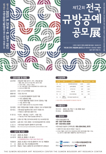 수원시가 주최하고 수원시규방공예연구회가 주관, 문화체육관광부·농촌진흥청이 후원하는 이번 공모전은 전통 규방공예의 아름다움을 표현하고 기술성·실용성 등을 갖춘 다양한 작품을 발굴하는 행사다.