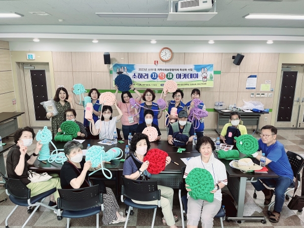 [금요저널] 광명시 소하1동 지역사회보장협의체는 지난 19일 동 행정복지센터에서 특성화 사업‘소하리지덕체아카데미’의 여섯 번째 수업으로 도구없이 맨손으로 가능한 자이언트 얀 방석만들기 뜨개질 수업을 진행했다.