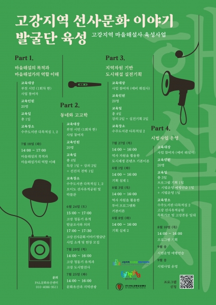 ‘고강지역 선사문화 이야기 발굴단 육성 용역’은 고강지역 도시재생 뉴딜사업의 일환으로 선사문화와 마을역사를 기록하고 마을해설 운영 기반의 마련을 통해 마을해설사를 육성하는 사업이다.