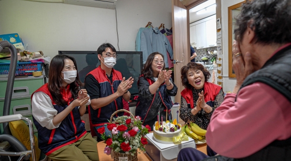 공무원과 지역의 순수 자원봉사자들로 구성된 ‘5福 방문단’이 독거 어르신 가정을 직접 방문해 5福 행福 생일福 사랑福 흥福)을 전하며 특별한 추억을 선사한다.