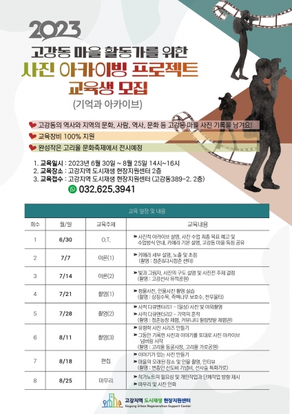 ‘2023년 고리울 문화 축제 용역’은 고강지역 도시재생 뉴딜사업의 일환으로 사진 아카이빙 교육 및 문화 다큐멘터리 제작 교육을 진행하며 고강지역 주민이 직접 참여하고 기획하는 과정을 통해 마을공동체 활동 기반을 강화하는 사업이다.