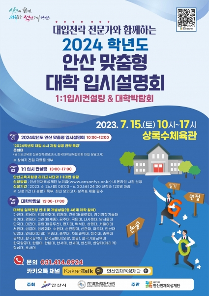 설명회는 문희태 한국대학교육협의회 대입 상담교사를 초빙해 ‘2024학년도 대입 수시지원 성공전략’이라는 주제로 90분간 진행하며 안산교육지원청 소속 전문 상담교사들이 개인별 성적분석을 통해 1대 1 컨설팅을 제공하고 맞춤형 대입 성공전략을 제시한다.