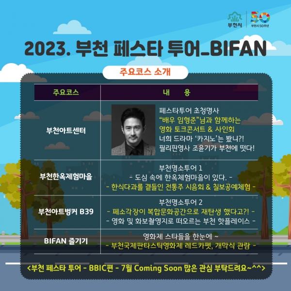 특히 6월 29일에는 드라마 ‘카지노’, 영화 ‘범죄도시’ 등에서 인상 깊은 연기를 보여준 배우 임형준 토크콘서트 및 사인회 BIFAN 개막식 및 레드카펫 관람 등 BIFAN을 더욱 알차게 즐길 수 있는 특화 투어코스가 준비되어 있다.