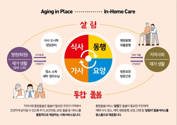 ‘누구나 살림’을 슬로건으로 지역 곳곳에 돌봄이 필요한 우리 이웃을 위해 병원, 외출 동행서비스 방문요양과 간호 식사, 도시락, 영양관리 청소,소독,세탁.정리수납 등 따뜻한 돌봄서비스를 원스톱으로 제공한다.