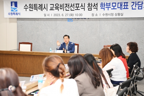 이재준 시장은 27일 시청 상황실에서 ‘수원특례시 교육비전 선포식’에 참석했던 학부모 대표들과 간담회를 열고 학부모가 교육 공동체에 참가할 방안 등을 논의했다.