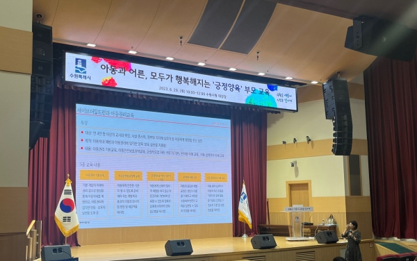 [금요저널] 수원시가 29일 시청 대강당에서 관내 민간 어린이집 영유아 부모 등을 대상으로 ‘긍정양육’ 교육을 했다.