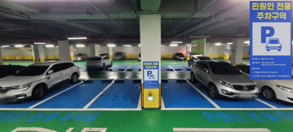주차면 바닥을 파란색으로 칠하고 ‘민원인 전용 주차구역’ 표지판을 설치했다.