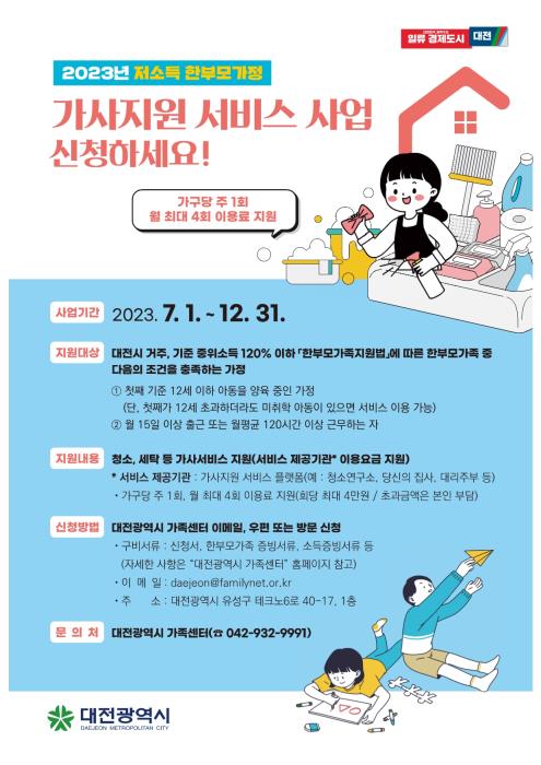 [금요저널] 대전시는 경제활동, 자녀양육 및 가사를 홀로 책임져야 하는 한부모의 가사 부담을 덜어주기 위해 7월부터 저소득 한부모가정 가사지원서비스 사업을 시행한다.