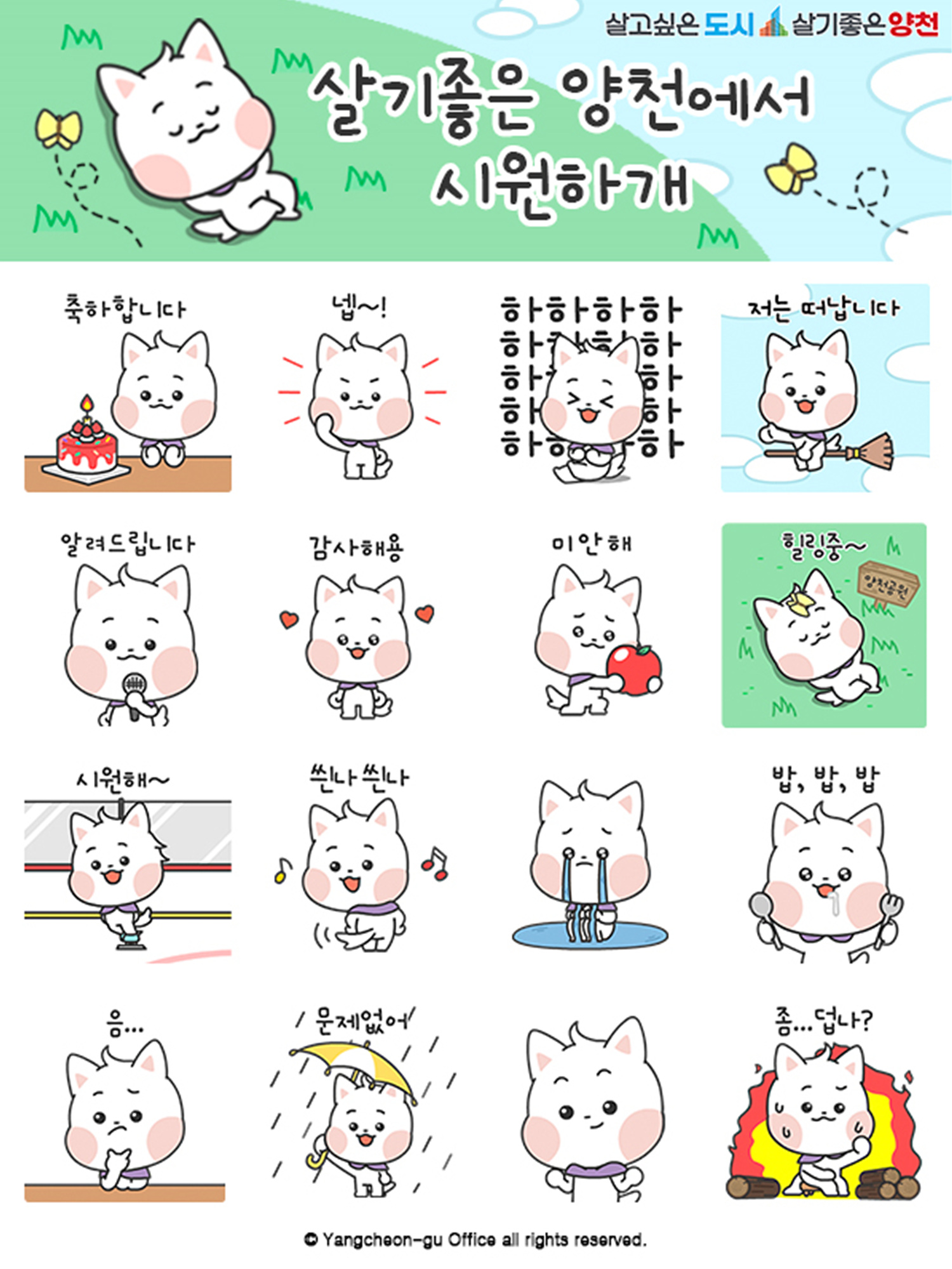 이를 위해 구는 여름을 맞아 ‘살기좋은 양천에서 시원하개(犬)’를 주제로 구의 마스코트인 강아지 ‘해우리’를 활용해 모든 연령층이 공감할 수 있고 일상생활에서 유용하게 사용할 수 있는 16종의 움직이는 이모티콘을 제작했다. 특히 여름의 계절감을 반영해 청량한 색상을 활용했으며, 구의 주요 명소인 양천공원 등을 배경으로 재치 있는 문구와 동작을 디자인했다.