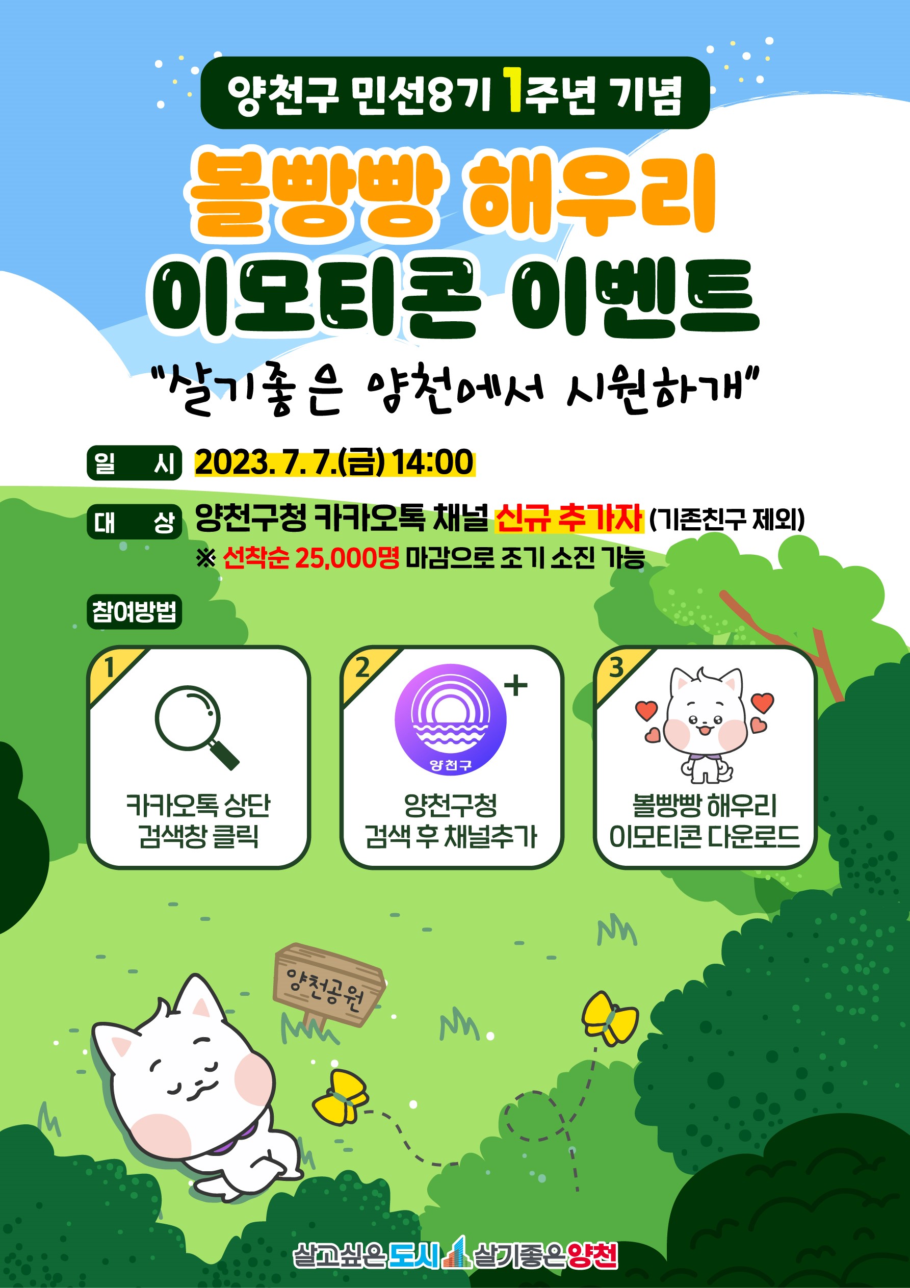 양천구(구청장 이기재)가 민선 8기 출범 1주년을 기념해 구 공식 캐릭터 ‘볼빵빵 해우리’ 이모티콘을 7월 7일 오후 2시부터 2만 5천명에게 선착순 배포하는 깜짝 이벤트를 실시한다.