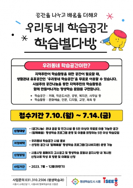 [금요저널] 시흥시는 ‘우리동네 학습공간 학습별다방’의 공간 나눔과 학습 프로그램을 공개모집한다.