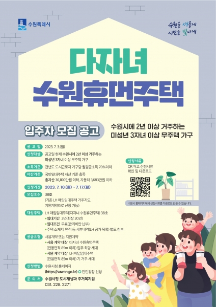 7월 10일부터 17일까지 모집하고 대상은 공고일 기준으로 수원시에서 2년 이상 연속 거주한, 미성년 자녀가 3인 이상인 무주택 다자녀 가구다.