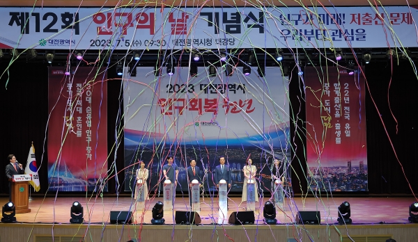 이날 개최된 인구의 날 기념식은 이장우 대전시장, 조원휘 대전광역시의회 부의장, 대전시 인구정책위원회 위원과 시청 소속 공직자 600여명이 참석한 가운데, 인구유공 표창과 인구회복 원년 선포식, 인구의 날 기념 공직자 대상 인구정책 특강 등으로 진행됐다.