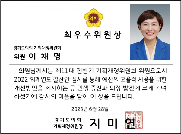 [금요저널] 4일 이채명 경기도의원이 경기도의회 2023년 상반기 기획재정위원회 최우수위원으로 선정됐다.