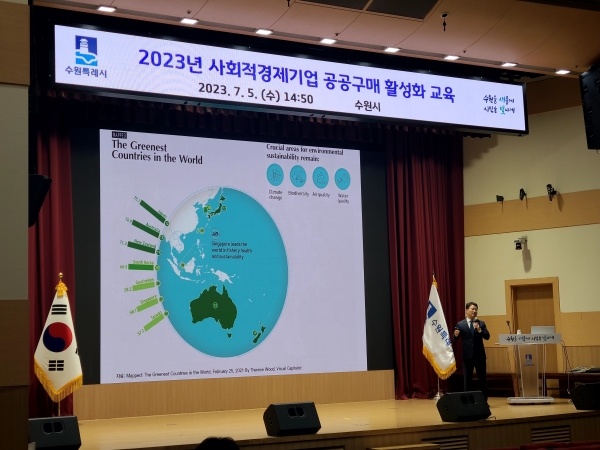 [금요저널] 수원시가 5일 시청 대강당에서 공직자와 산하기관 직원을 대상으로 ‘사회적경제기업 공공구매 활성화 교육’과 ‘공정무역 교육’을 진행했다.