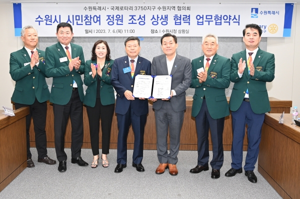 수원시와 국제로타리 3750지구 수원지역협의회는 6일 시청 상황실에서 업무협약을 체결하고 협력을 약속했다.