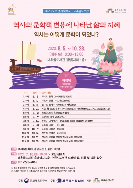 [금요저널] 수원시 대추골도서관이 2023년 도서관 지혜학교 ‘역사의 문학적 변용에 나타난 삶의 지혜’ 수강생을 10일 오전 10시부터 모집한다.