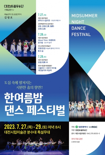 ‘한여름밤 댄스 페스티벌’은 대전시립무용단의 대표 기획공연으로 뜨거운 여름, 열대야에 지친 시민들을 위한 도심 속 피서지이자 매해 많은 관객이 찾는 우리 지역의 대표적인 춤 축제이다.