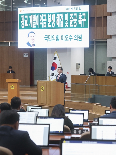[금요저널] 경기도의회 농정해양위원회 이오수 의원이 11일 열린 경기도의회 제370회 임시회 제1차 본회의에서 10년 넘게 이어지고 있는 광교 개발이익금 관련 분쟁 해결 및 의혹 해명을 촉구하는 5분 자유발언을 펼쳤다.