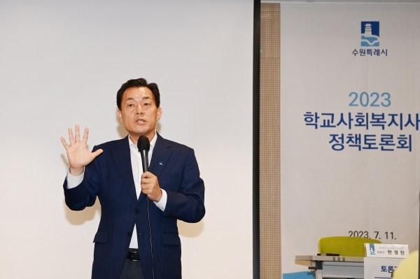 이날 토론회에는 이재준 수원시장과 수원특례시의회 김기정 의장, 이재식 부의장, 학부모, 학교장, 학교사회복지사업 관계자 등 200여명이 참석했다.