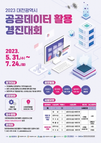 대전시는 시민들의 공모 참여 기회를 확대하고 지역 혁신 아이디어를 발굴하기 위해 ‘2023 공공데이터 활용 경진대회’공모 마감일을 연장한다고 밝혔다.