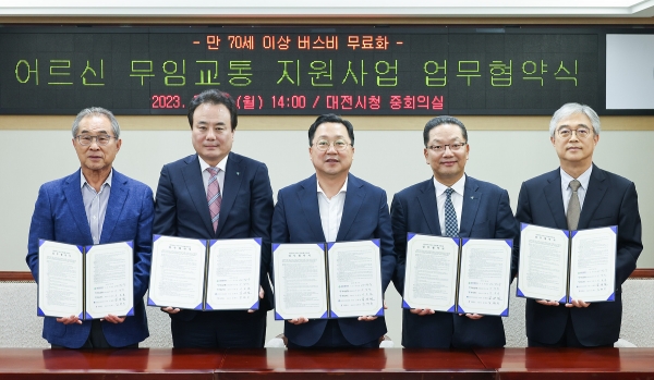 [금요저널] 대전시는 17일 하나은행, 하나카드, 버스운송사업조합, 티머니와 ‘만 70세 이상 어르신 무임교통 지원사업을 위한 업무협약’을 체결했다.