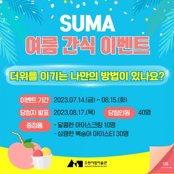 또한 폭염이 지속되는 올해 여름을 시원하게 보낼 수 있도록 ‘SUMA 여름 간식 이벤트’를 미술관 SNS에서 개최한다.