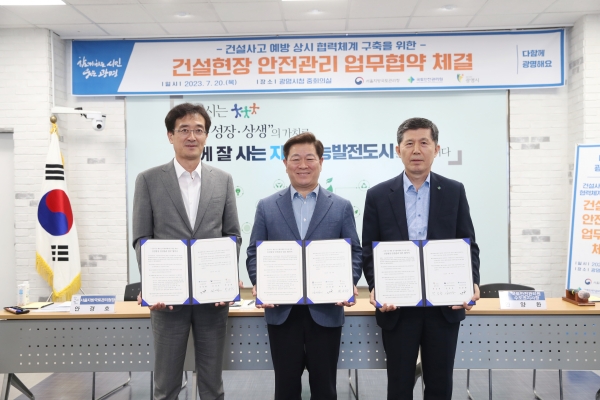 시는 20일 오전 시청 중회의실에서 박승원 광명시장, 안경호 서울지방국토관리청장, 안양환 국토안전관리원 수도권지사장이 참석한 가운데 ‘건설현장 안전관리 업무협약’을 체결했다.