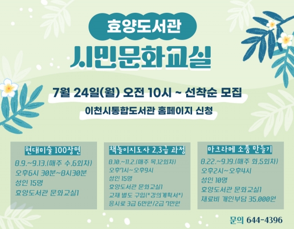 [금요저널] 이천시 이천시립효양도서관에서 오는 8월 9일부터 이천시민의 독서문화 진흥을 위해 시민문화교실을 운영한다.