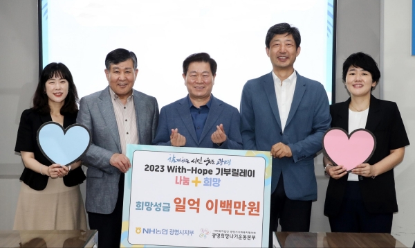 [금요저널] NH농협 광명시지부는 광명시 복지사각지대 저소득 가정 및 복지기관 지원에 써달라며 광명시사회복지협의회 희망나기운동사업에 희망 성금 1억 2백만원을 기탁했다.