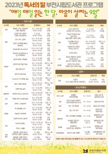 [금요저널] 부천시립도서관은 9월 독서의 달을 맞아 다양한 행사와 프로그램을 운영한다.