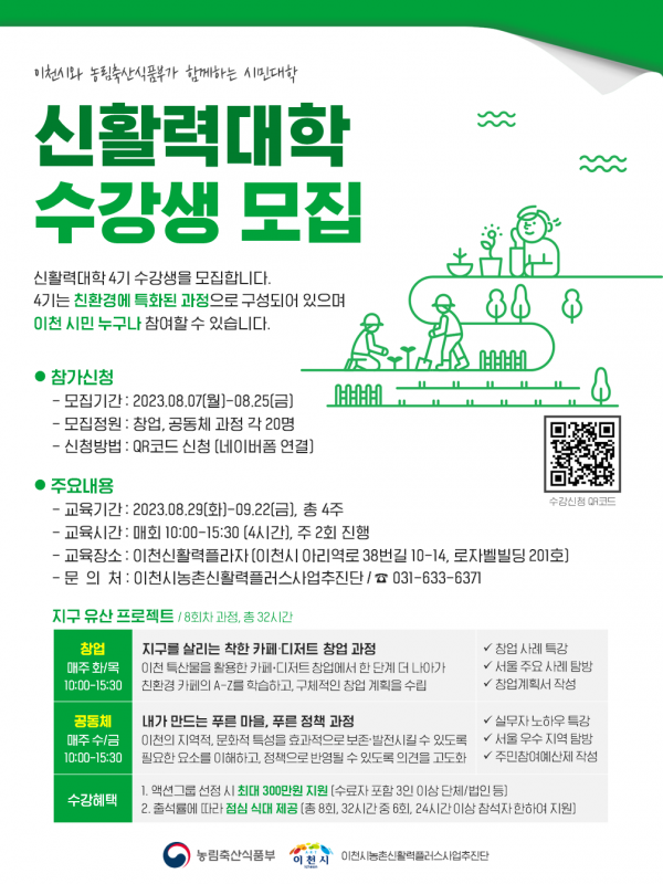 [금요저널] 이천시 농촌신활력플러스사업추진단은 2023년 8월 1일부터 '이천신활력대학' 4기 수강생을 모집한다.