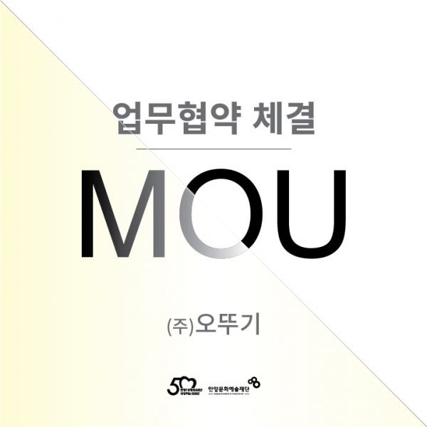 [금요저널] 안양문화예술재단은 ㈜오뚜기와 제7회 안양공공예술프로젝트의 성공적 개최 및 시 승격 50주년을 맞은 안양 지역사회의 지속 가능한 발전을 도모하기 위한 업무협약을 2일 서면으로 체결했다고 밝혔다.